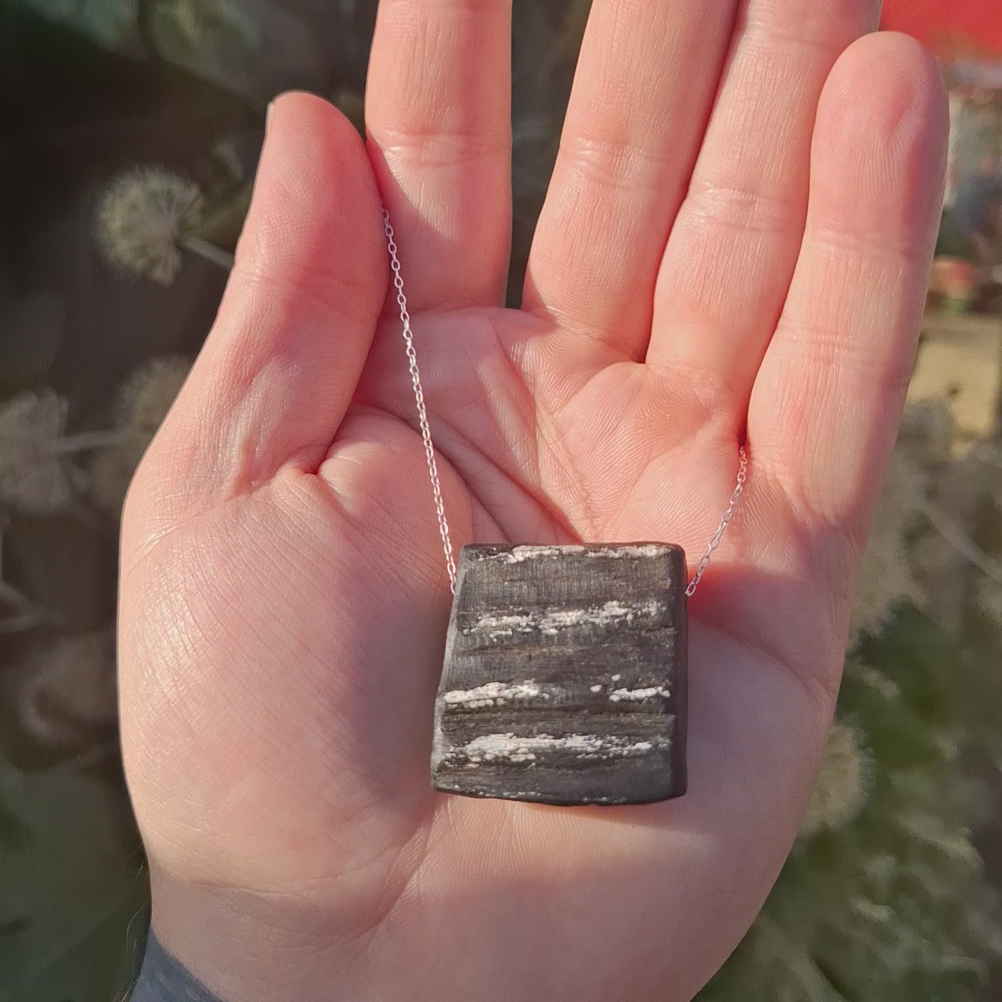 Línte Álainn - or 'lovely lines'. A pendant made from ancient bog oak in the Athenry region of Co Galway and estimated to be between 3,000 and 6,000 years old. It is embellished with a little delicate fine silver leaf on one side. It can be worn either way around - one side has rugged raw bog oak bark patterns! Full details here.