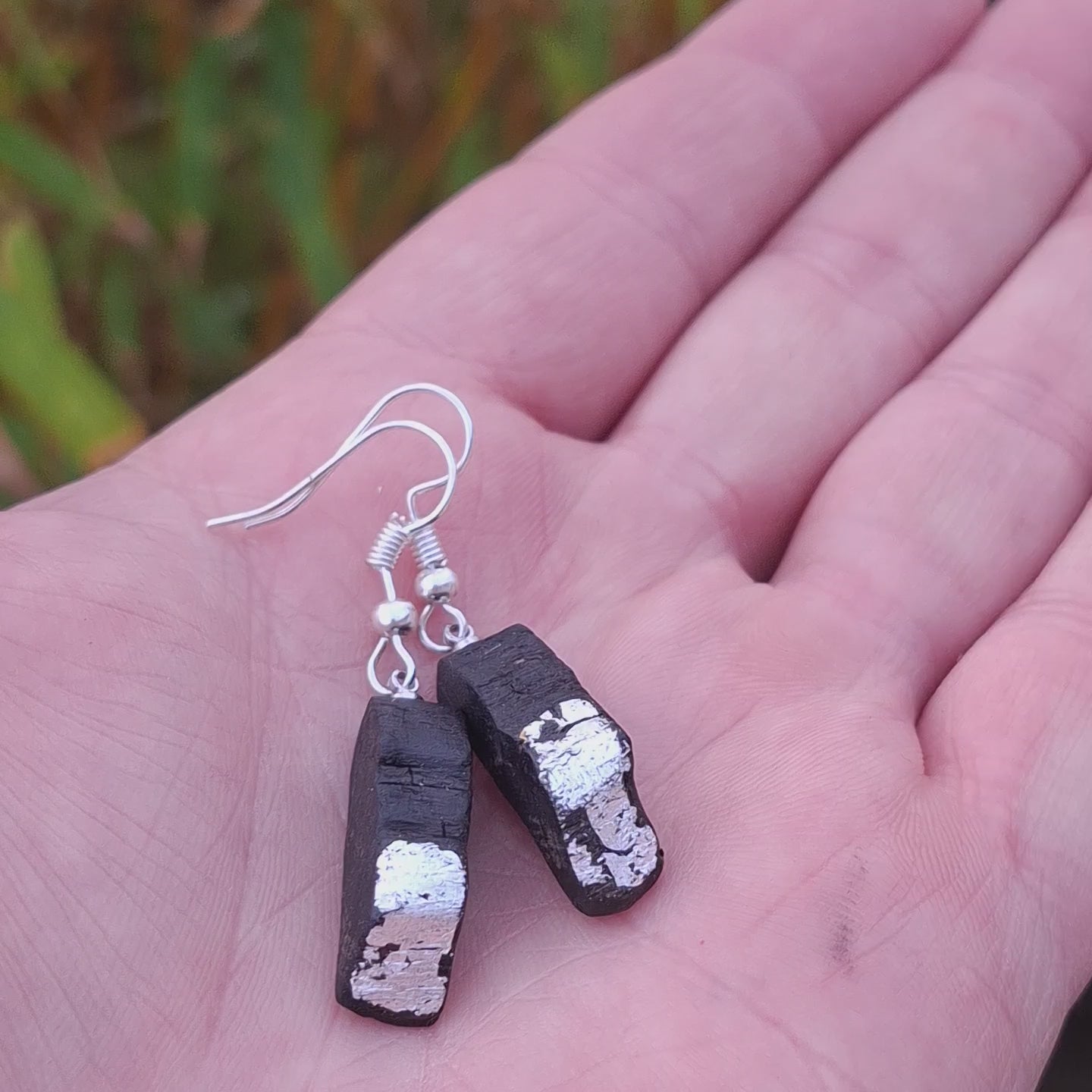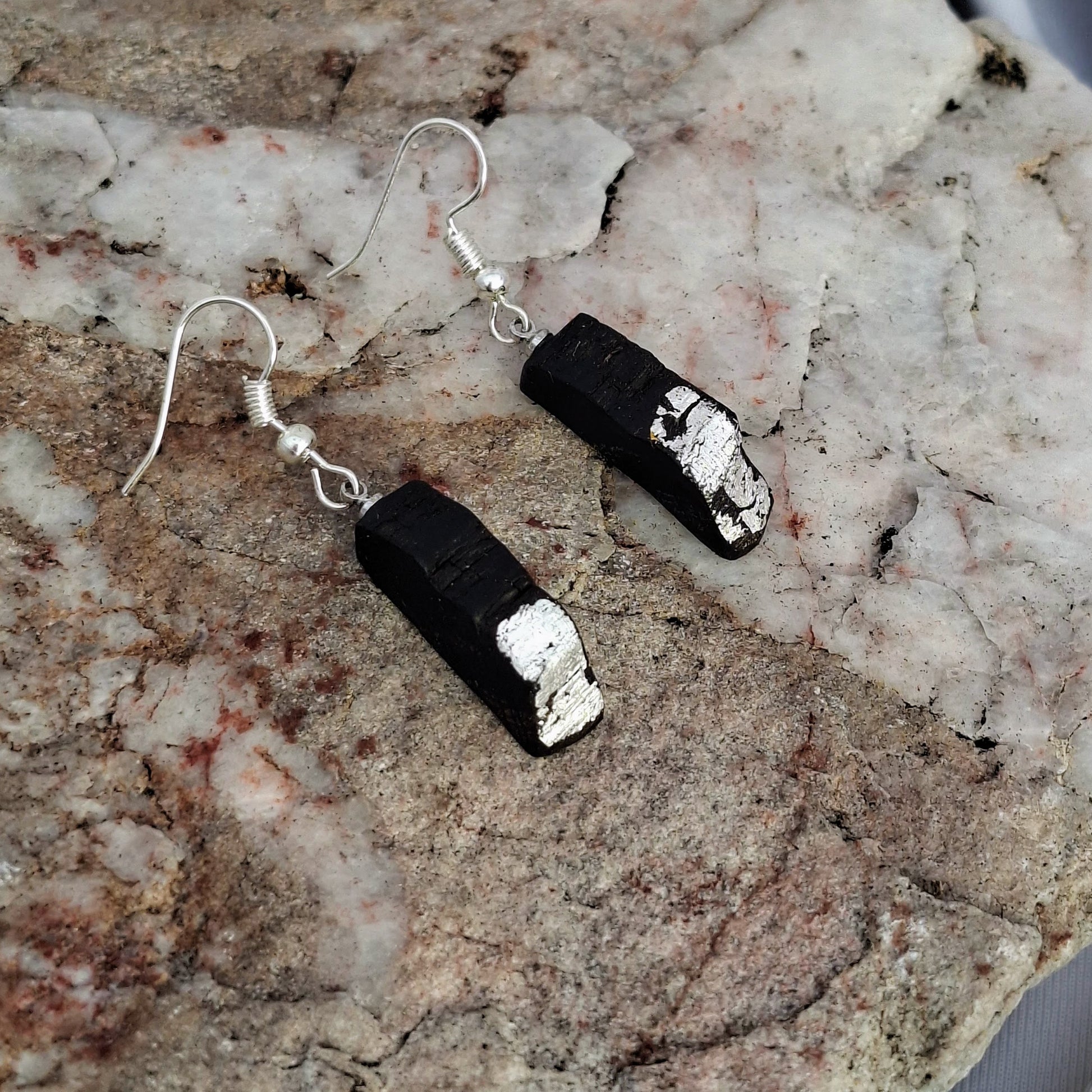 Airgead Sa Dorchadas – ein Hauch von Silber in der Dunkelheit. Diese Ohrringe aus Mooreiche erhellen die Nacht! Sie sind aus 3.000 bis 6.000 Jahre altem Holz gefertigt, das in der Nähe von Athenry, County Galway, gefunden wurde, und mit feinem Silberblatt veredelt.