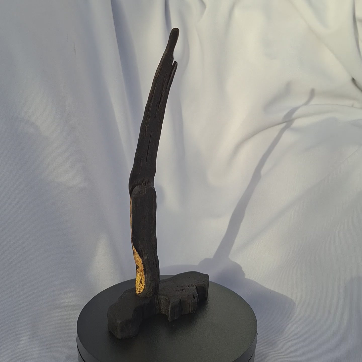 „An Cleite Caillte – Die verlorene Feder “ ist eine Skulptur, die ich aus uralter irischer Mooreiche geschnitzt habe. Das Holz wurde in der Nähe von Athenry in der Grafschaft Galway ausgegraben. Man schätzt, dass das Holz zwischen 3.000 und 6.000 Jahre alt ist! Die 22 cm hohe, schlanke, federartige Form zeugt von Zerbrechlichkeit, Erinnerung und dem, was zurückbleibt. Ein Hauch von 23,75-karätigem Blattgold schimmert auf dem dunklen Holz wie ein Lichtrest im Schatten. Von der Zeit geformt und von Hand bewahrt, verkörpert diese Skulptur Verlust, Widerstandsfähigkeit und die stille Schönheit der Dinge, die einst getragen und dann zur Erde zurückgebracht wurden.