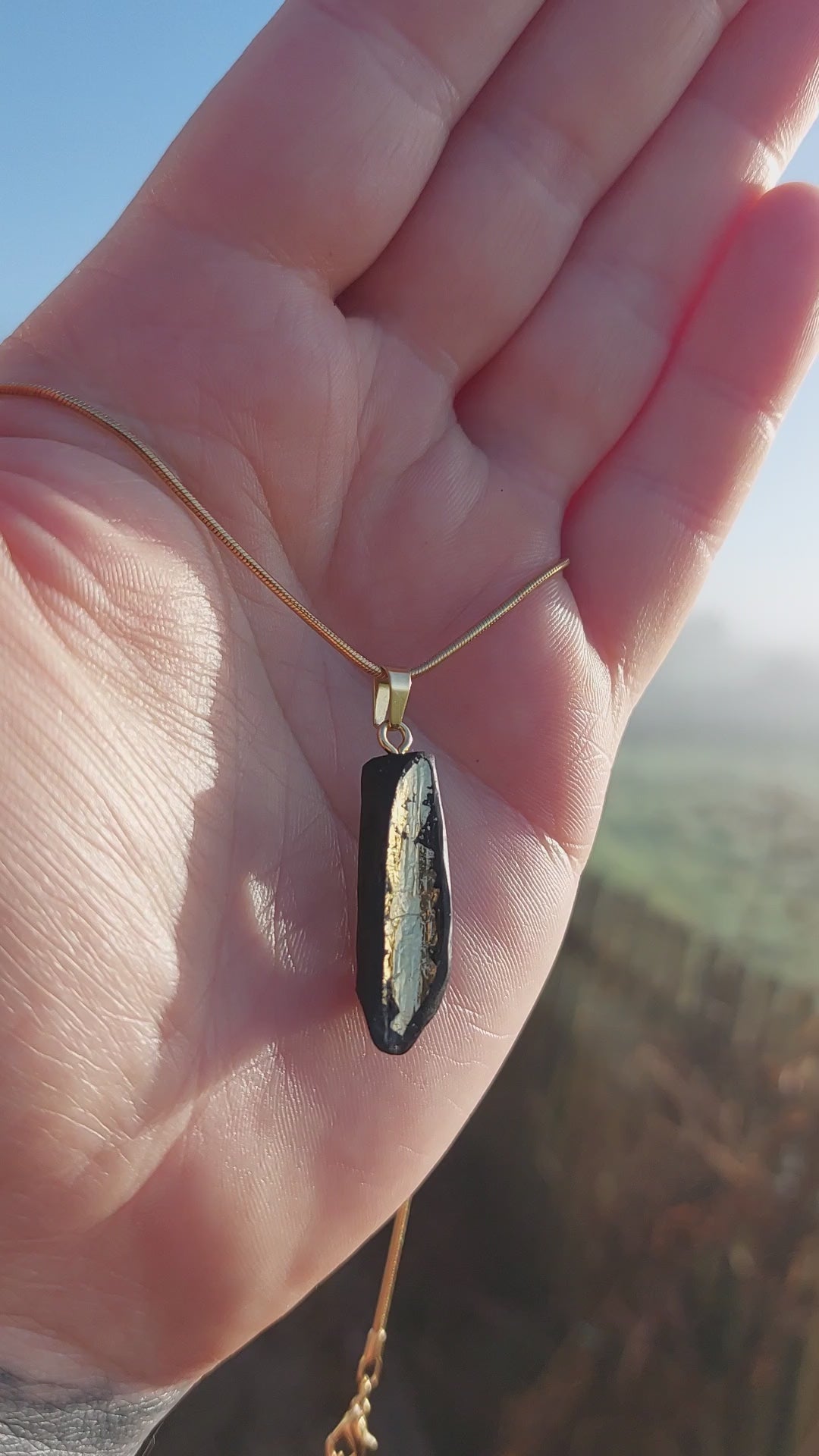 Unique and one of a kind piece crafted from bog oak sourced in the Athenry area of County Galway. This piece is finished with gold coloured leaf and matched with a gold plated 1.1mm snake chain. Shipped in black jewellery box.