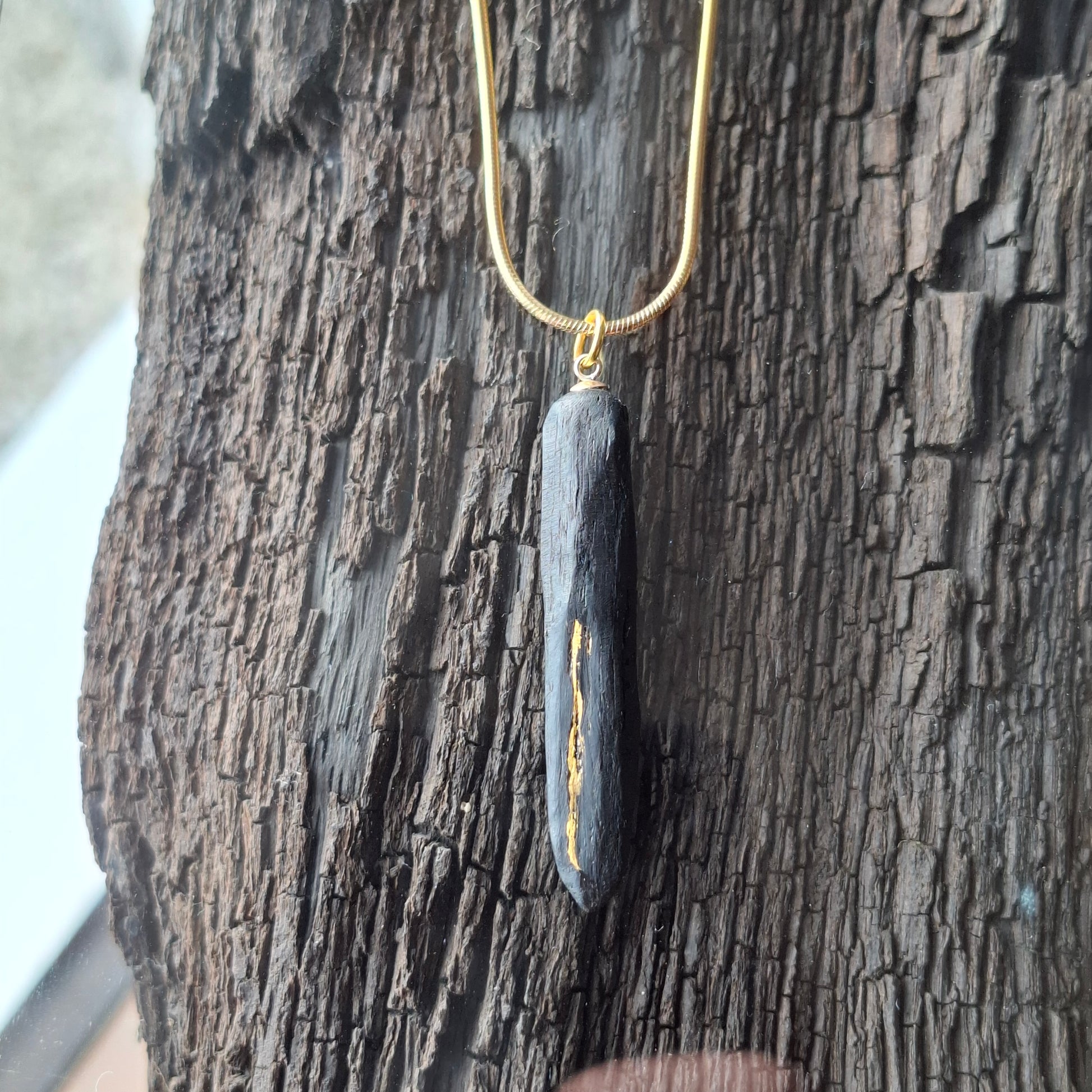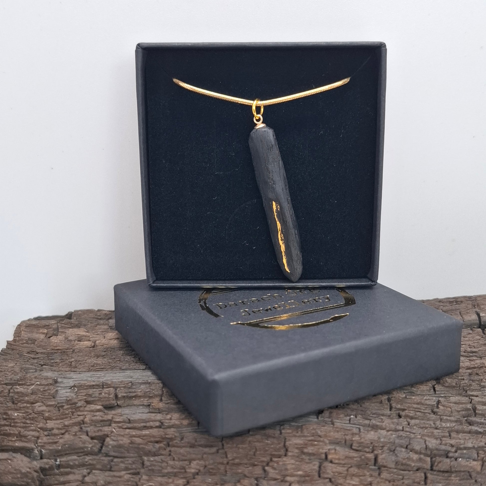 Cadhla, which translates to "beautiful" or "graceful" is a pendant made from bog oak found near Athenry, Co. Galway. It is long and slender piece with a vein of gold in it's crevices. The pendant is finished with 23.75ct yellow gold leaf and a gold filled hooplet. It comes with either a 40cm/16" or 45cm/18" gold plated 1.1mm snake chain.