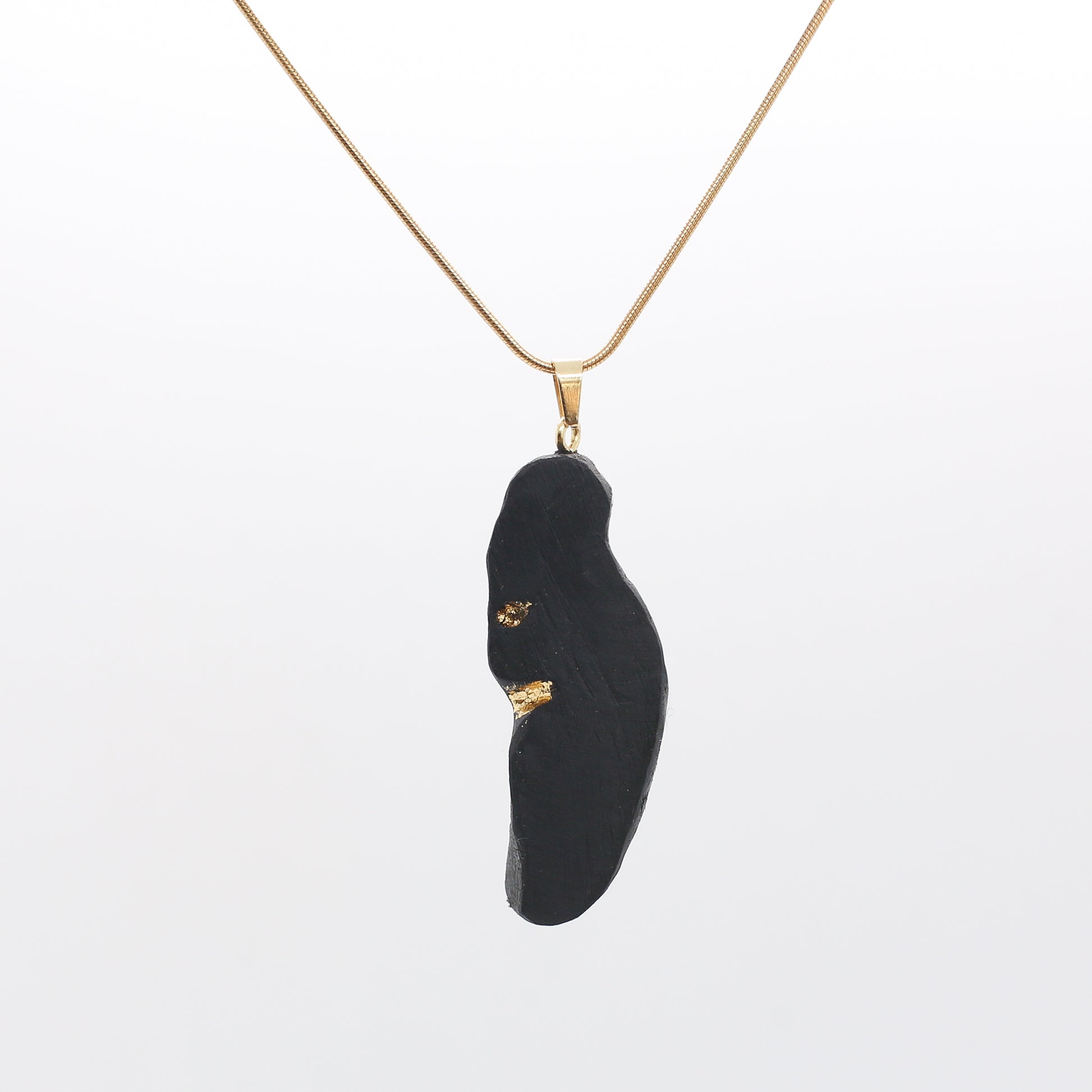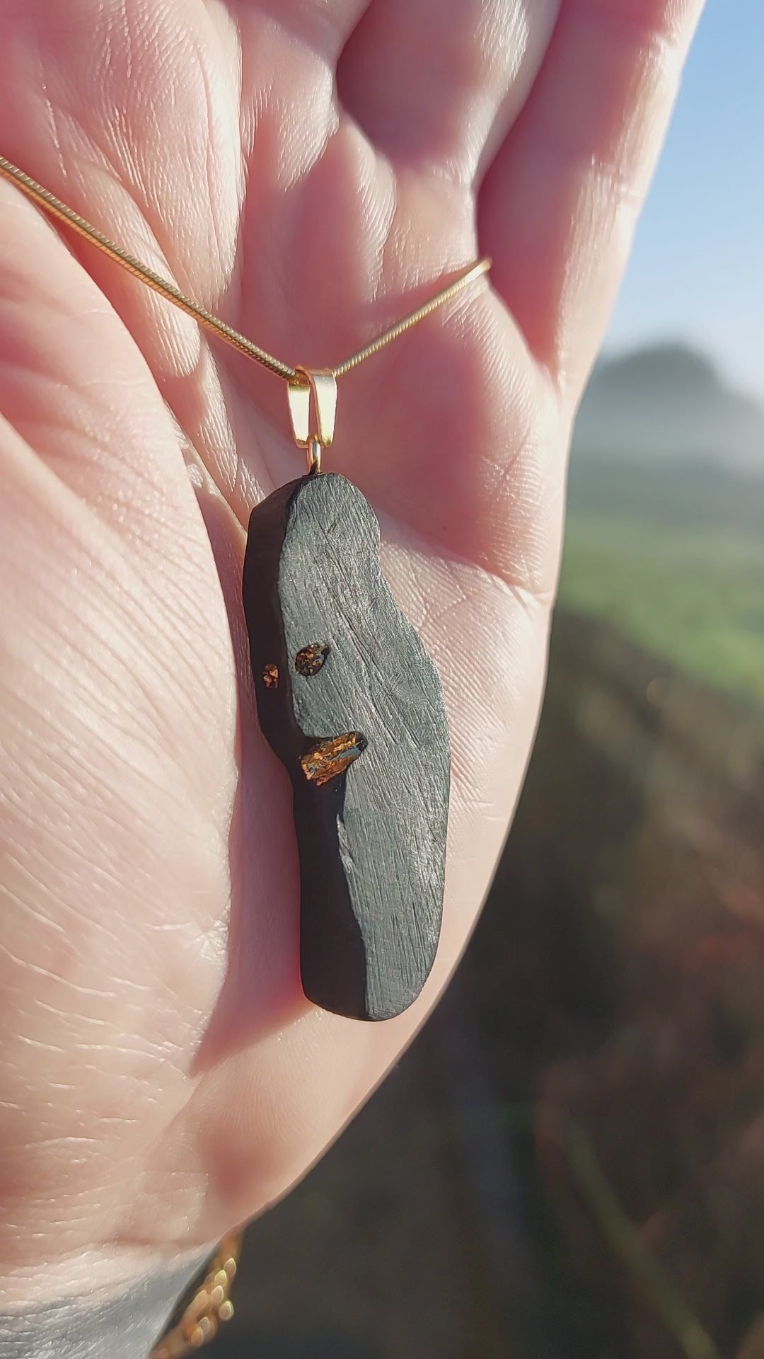 Unique and one of a kind piece crafted from bog oak sourced in the Athenry area of Co. Galway. This piece is finished with gold coloured leaf and matched with a gold plated 1.1mm snake chain - please keep it dry and polish regularly as it can tarnish. Contact me for other chain options please. Shipped in black jewellery box.