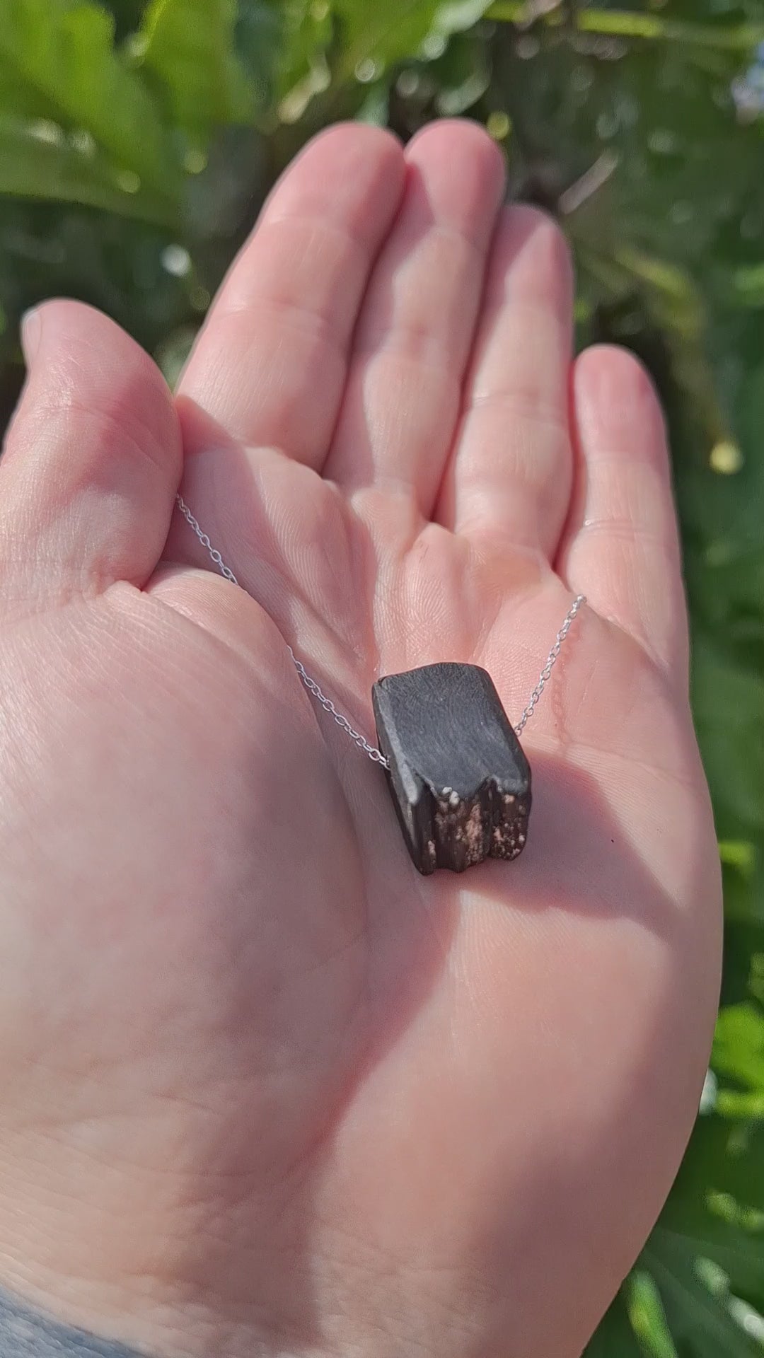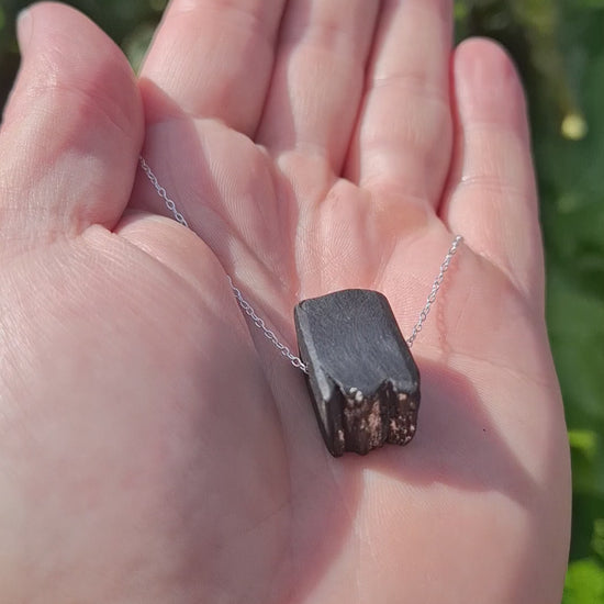 The pendant is made from ancient bog oak in the Sliabh Aughty mountains on the Co. Clare/Co. Galway border in Ireland - estimated to be between 3,000 and 6,000 years old. It is embellished with a little delicate fine silver leaf and comes with various options of chains: