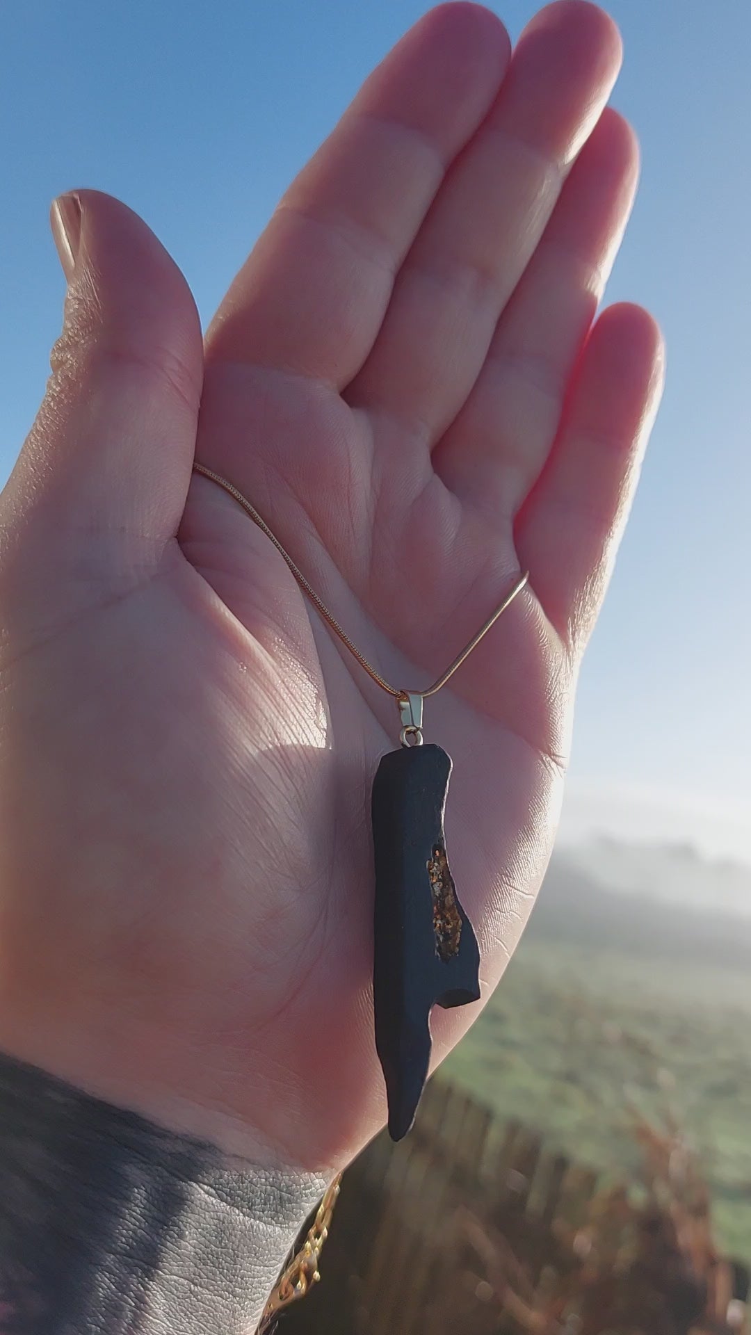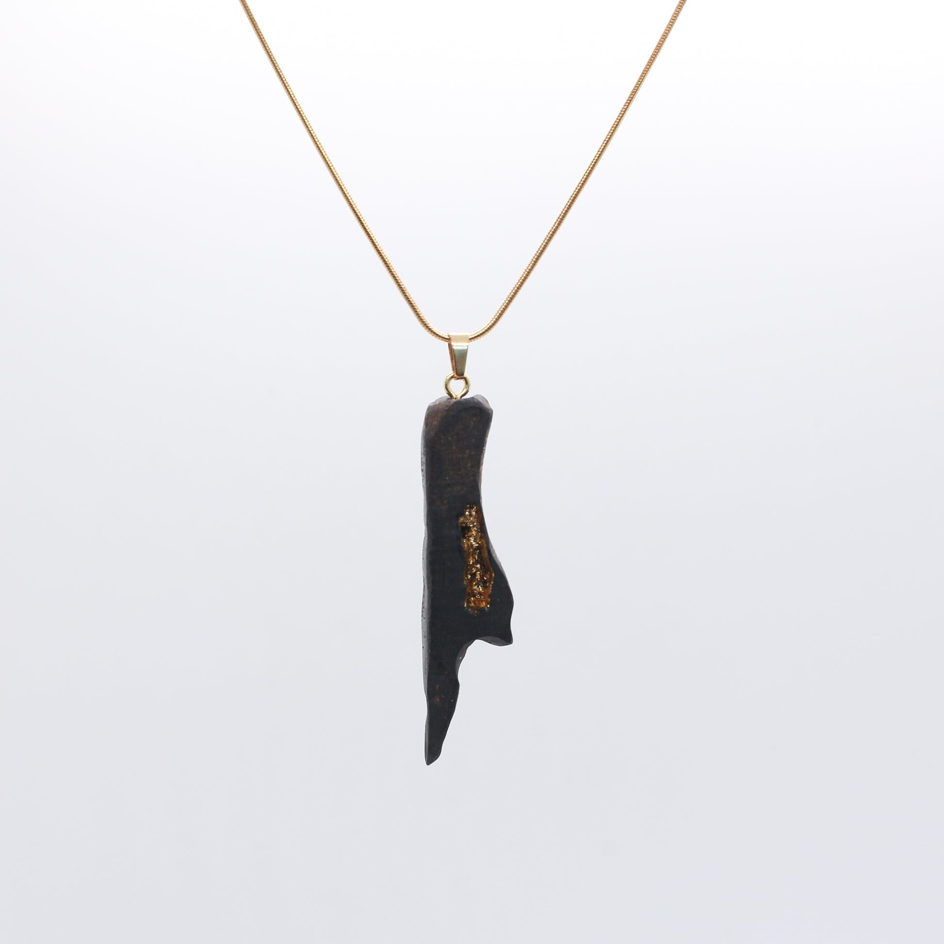 Unique and one of a kind piece crafted from bog oak sourced in the Sliabh Aughty mountains. This piece is finished with gold coloured leaf and matched with a gold plated 1.1mm snake chain. Shipped in black jewellery box.