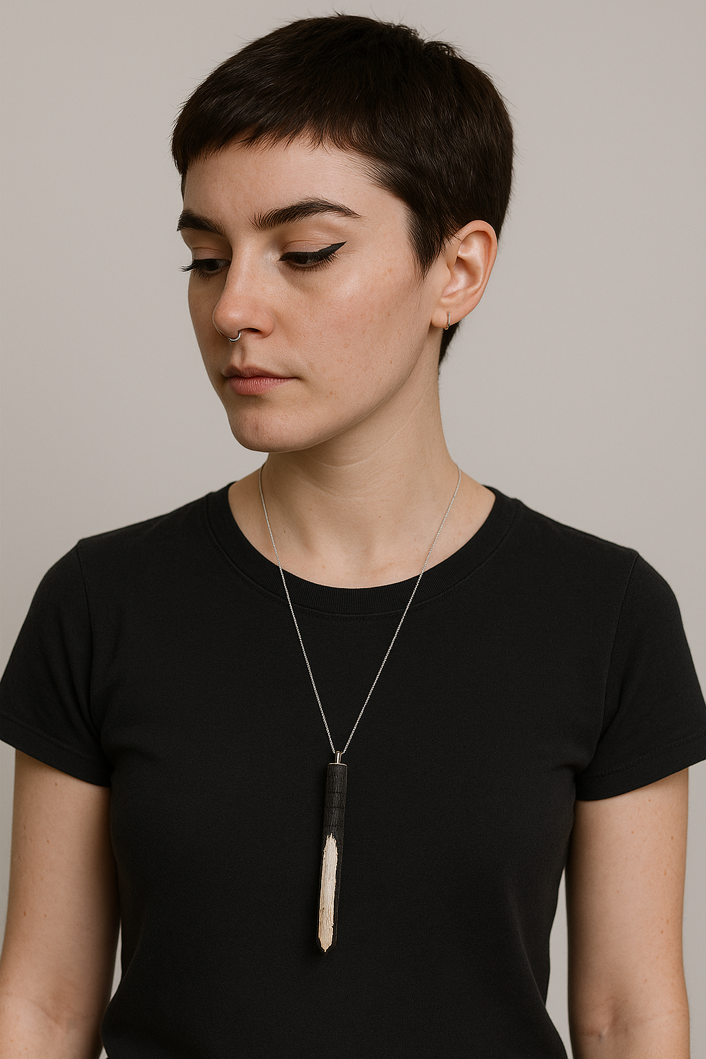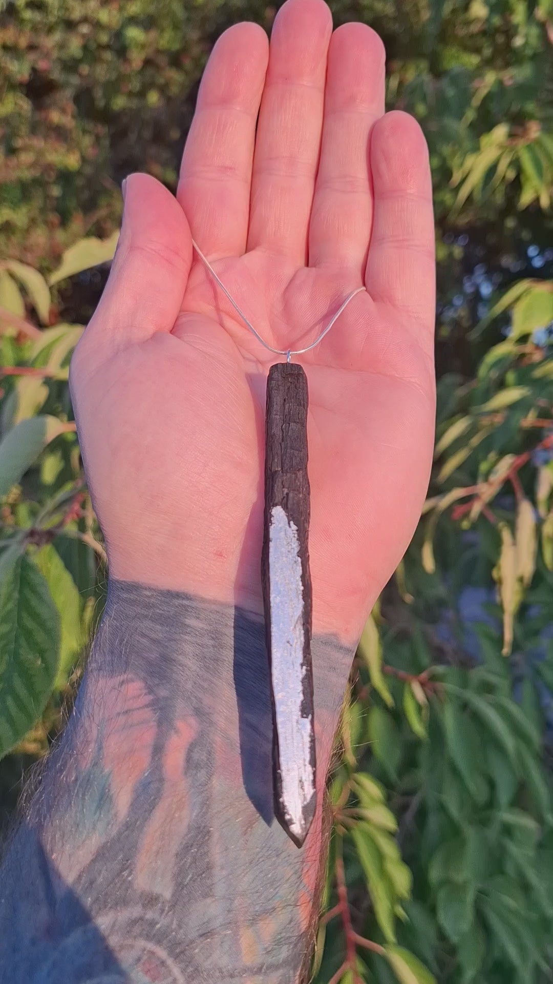 Saigheadmhar is a pendant made from bog oak found near Athenry, Co. Galway. The name means 'arrow-like, piercing, sharp'. This statement piece will turn heads. Be brave - you are armed when wearing this gorgeous piece.